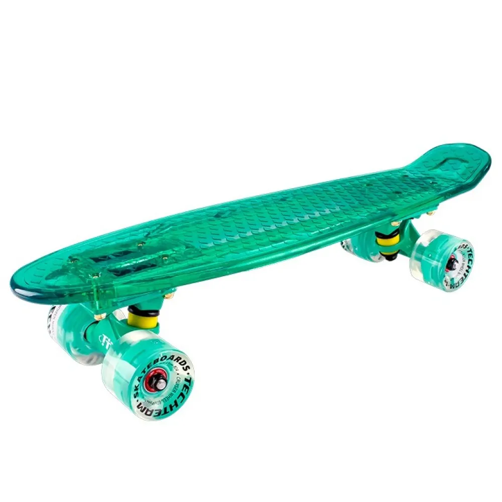 Скейтборд пластиковый Transparent 22 light бирюзовый цвета морской волны позволит отлично провести время с друзьями. Полиуретановые колёса обеспечат хорошую сцепку с дорогой и мягкость езды. Хорошую скорость скейтборду придают подшипники класса ABEC 7. Несмотря на прозрачность материала, который создаёт иллюзию хрупкости, конструкция достаточна крепка и надёжна, способна выдержать до 100 кг . Рифлёная поверхность не даст соскользнуть ноге, а подвеска из алюминия придаст отличную манёвренность.
