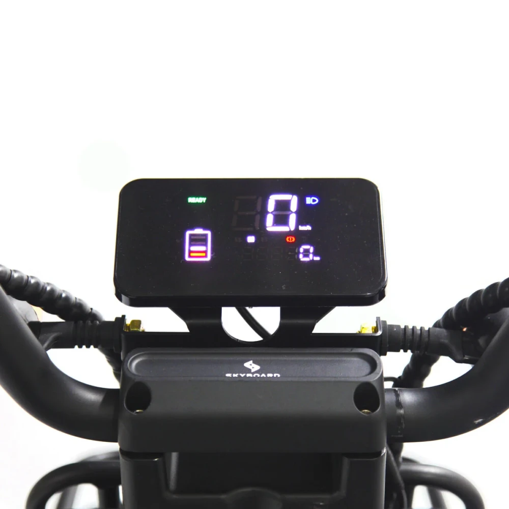Батарея съемная 25Аh 60V обеспечит до 50 км максимального расстояния на одном заряде. При этом время зарядки составляет всего несколько часов. Несмотря на такое расстояние, скорость Skyboard Kamchatka 3000W может достигать до 55 км/час, что является весьма приличным показателем для скоростного электроскутера.