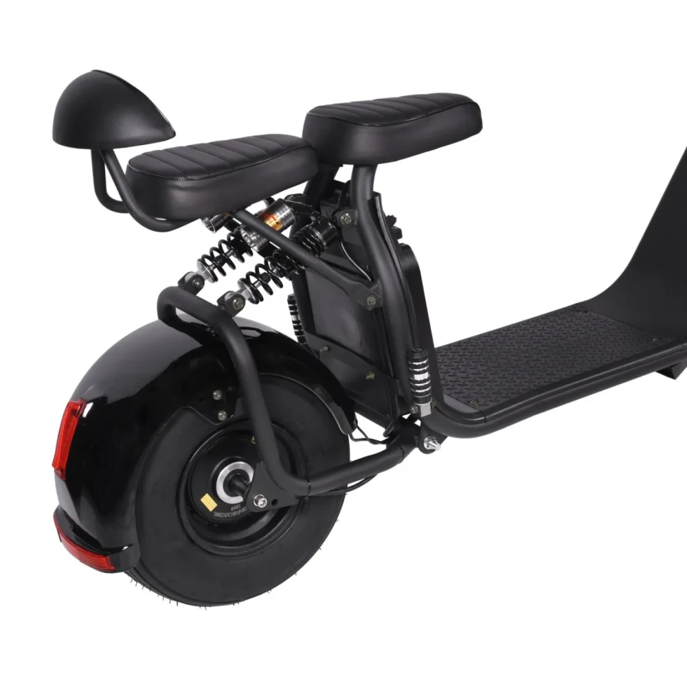 Электроскутер CityCoco Kugoo C2 PRO - усовершенствованный вариант уже полюбившейся и хорошо зарекомендовавшей себя модели. В данной модификации производители предусмотрели более мощный двигатель и аккумулятор. Теперь электроскутер быстро и плавно разгоняется до 45 км/час, легко преодолевает препятствия и подъемы. Одного заряда батареи хватает для преодоления 45-ти километров пути. Этого вполне достаточно для поездок в течение всего дня. Главным преимуществом данной модели является дополнительное сидение для пассажира. Улучшенная амортизация и усиленная подвеска позволяют пользоваться электроскутером вдвоем, что значительно расширяет область его применения. Благодаря широким 8-ми дюймовым колесам, ездить на электроскутере возможно не только по ровным городским улицам, но и по бездорожью. Данная модель оснащена качественной системой освещения. Яркая передняя фара, задние габаритные огни и поворотники повышают безопасность движения в темное время суток и предупреждают других участников движения о совершаемых маневрах. Надежные гидравлические тормоза чутко реагируют на команду райдера и гарантируют быструю остановку электроскутера Kugoo C2 PRO в экстренной ситуации.