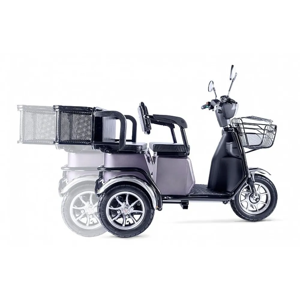 Колесная часть – устойчивая, рассчитана на всесезонье. Маневренность и безопасность езды проверена неоднократным тестированием производителя. Если для вас комфорт и удобство занимают лидирующие позиции, предлагаем заказать именно эту модель трицикла.
