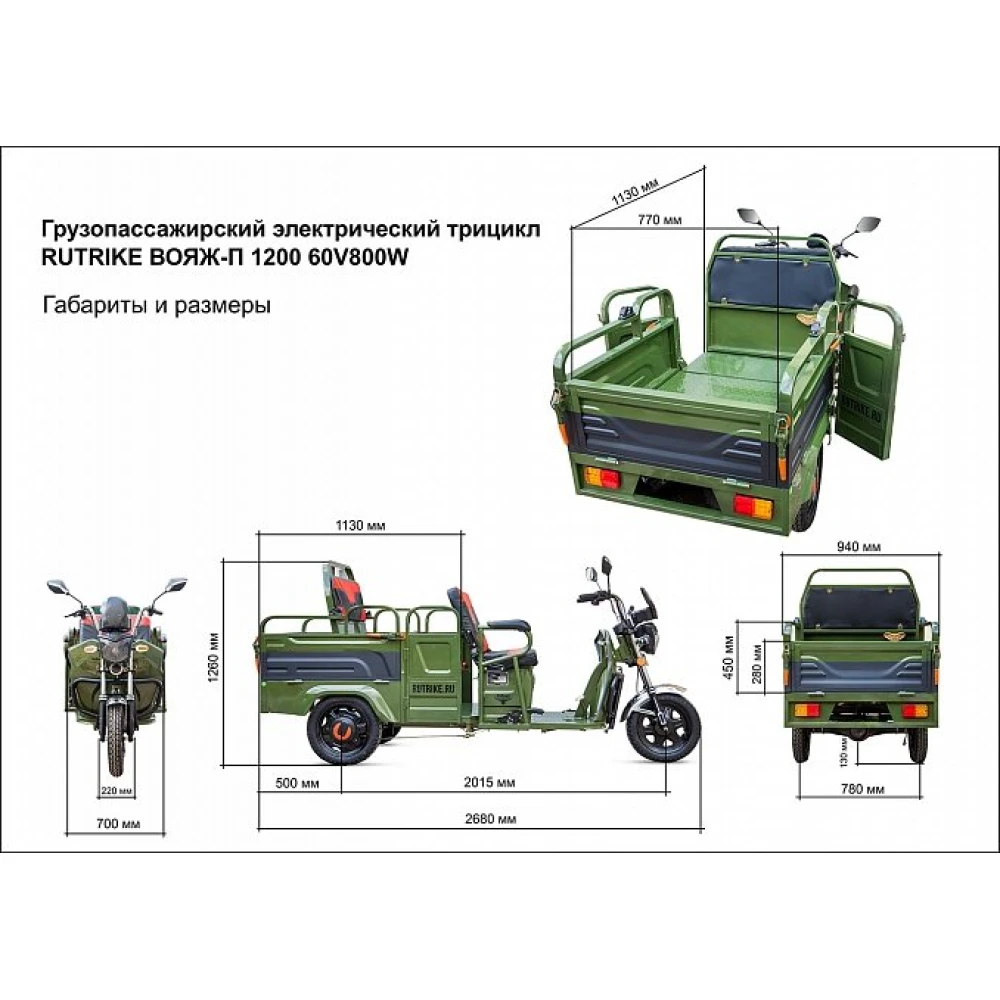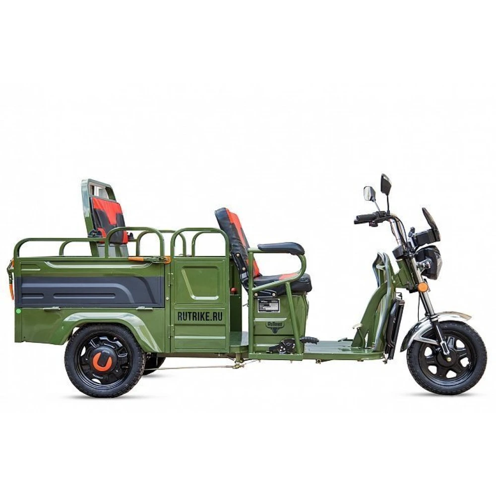 Груовой электротрицикл Rutrike Вояж-П 1200 Трансформер 60В 80 Вт в зеленом цветовом оттенке - техника, предназначенная для лиц с активной жизненной позицией, жителей сельских районов, для которых отдых на свежем воздухе находится на первом месте. Электротрицикл грузоподъемностью до 400кг идеально подходит для вылазок с друзьями, езды на рыбалку и другие мероприятия на природе.
