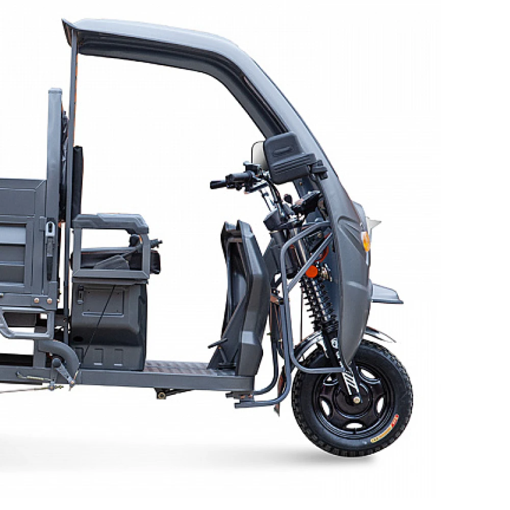 Грузовой электротрицикл Rutrike D5 КАБИНА гидравлика 1700 60V1200W – это высокомощное и надежное транспортное средство, специально разработанное для эффективной перевозки грузов в городских и пригородных условиях. Его конструкция сочетает прочность, функциональность и продуманный комфорт, что делает его незаменимым решением для бизнеса и логистики.Устройство оснащено 1200-ваттным двигателем, работающим при напряжении 60V, что обеспечивает устойчивое ускорение и позволяет достигать максимальной скорости до 25 км/ч. Несмотря на ограниченный пробег до 18 км на одном заряде, эта модель оптимально подходит для локальных перевозок, где важна надежность и точность доставки.Конструкция трицикла впечатляет своими размерами и грузовыми возможностями: вес устройства составляет 395 кг, а максимальная нагрузка достигает 900 кг, что позволяет перевозить значительные объемы товаров. Переднее колесо диаметром 3,75 дюйма и заднее – 4,00 дюйма, способствуют стабильному сцеплению с дорогой и уверенной маневренности даже на сложном рельефе. Габаритные размеры в собранном состоянии – 3200×1200×1770 мм – подчеркивают его внушительный масштаб и практичность при работе в условиях ограниченного пространства.Аккумулятор с емкостью 80 Ah обеспечивает питание на протяжении коротких маршрутов, а время полной зарядки составляет около 8–10 часов. Это позволяет оперативно возвращать транспортное средство в строй после выполнения задач. Дополнительная безопасность обеспечивается надежной барабанной тормозной системой, которая гарантирует эффективное торможение даже при интенсивном движении.Кабина гидравлического типа предлагает комфорт и защиту оператора от неблагоприятных погодных условий, делая работу на маршруте максимально удобной. Кроме того, данный электротрицикл способен преодолевать подъемы с максимальным углом в 15 градусов, что расширяет его эксплуатационные возможности.В итоге, грузовой электротрицикл Rutrike D5 КАБИНА гидравлика 1700 60V1200W – это современное, мощное и функциональное решение для локальной доставки и перевозки грузов, которое сочетает надежность, удобство и продуманную эргономику в одном устройстве.
