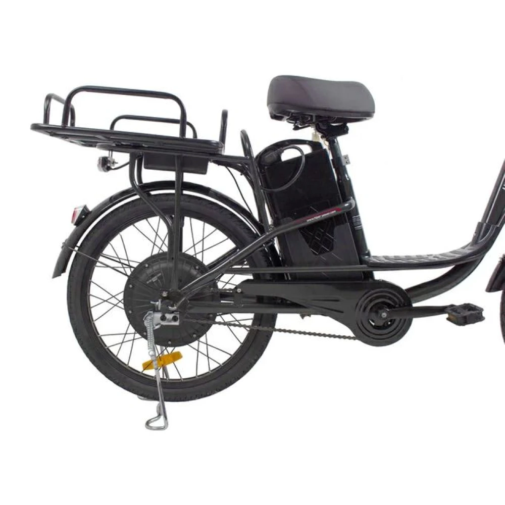 При максимальной грузоподъемности 130 кг и параметрах электродвижка 350 Вт скоростные параметры достигают 25 км/час, а максимальный запас хода составляет 45 км. Батарея емкостью 12 А*ч размещена за подседельной трубке в специальном защитном блоке. АКБ быстро заряжается, относится к категории быстро съемных элементов.