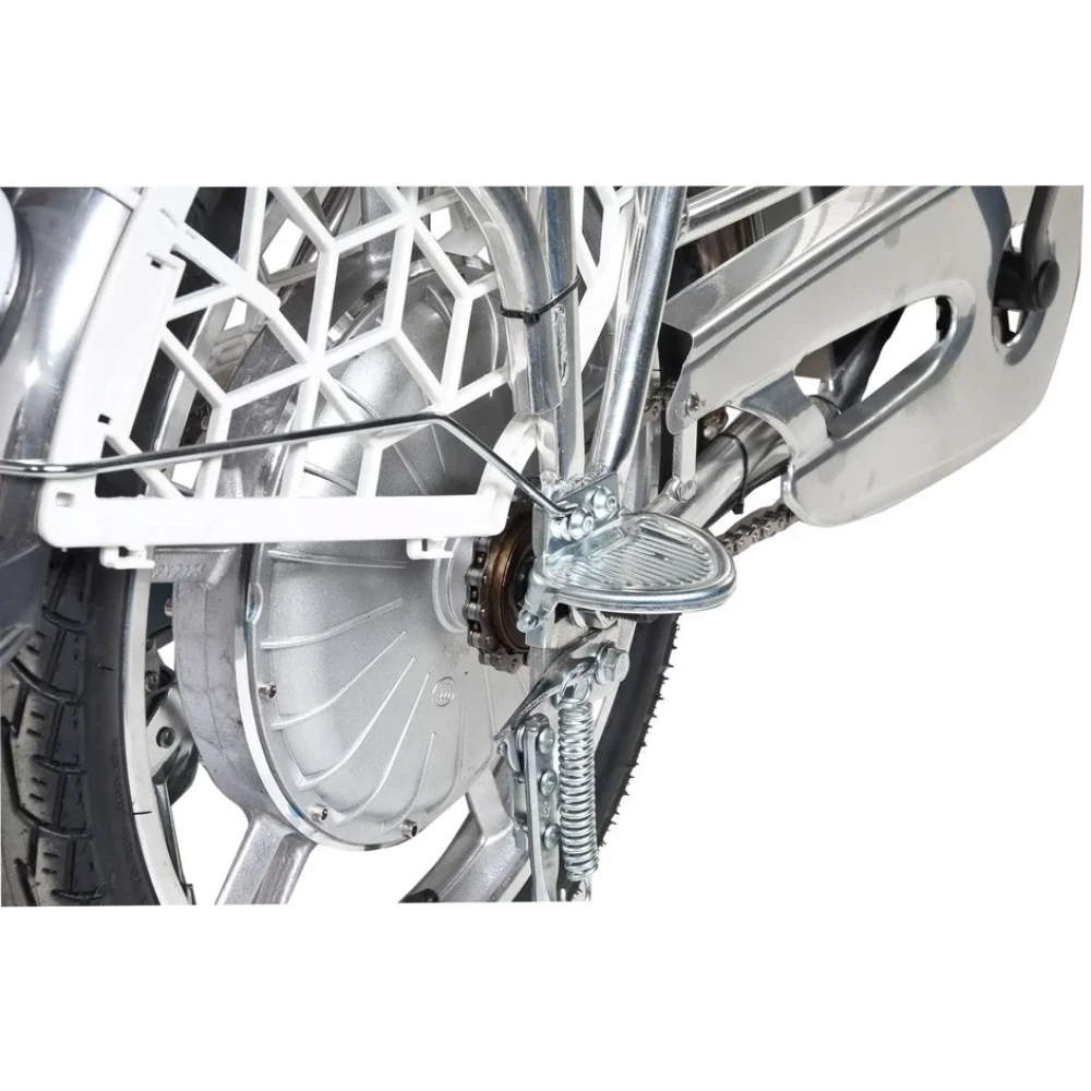 Электровелосипед оснащен большими устойчивыми колесами, мягким сиденьем для водителя и пассажира. Второе имеет удобную спинку, снижающую нагрузку с позвоночника. Техника оснащена всем необходимым для активного время провождения, поездки в магазин