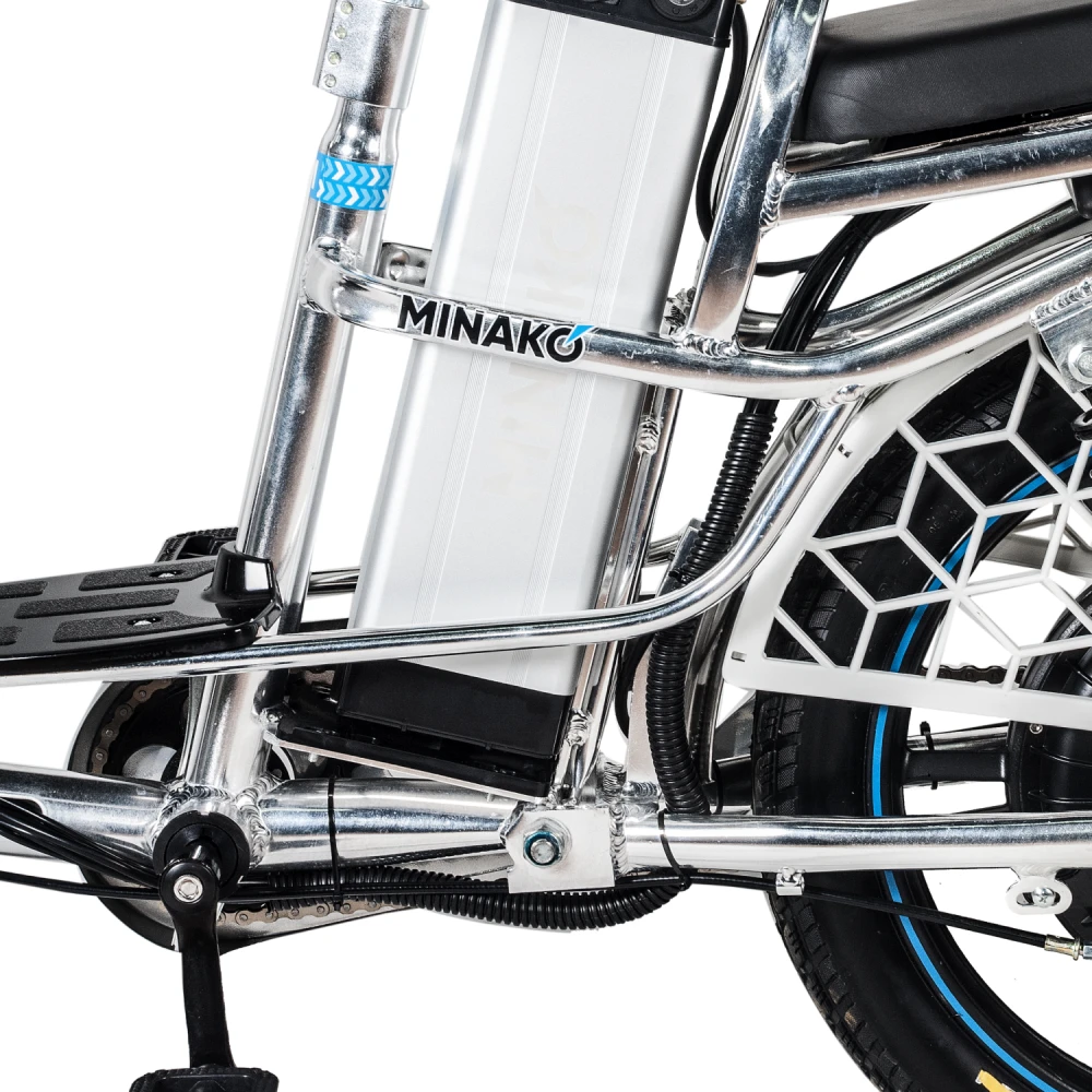 Велогибрид Minako V8 Pro идеально сочетает в себе комфорт и большую дальность хода, скорость и практичность. Приписка + 15 Ah в названии модели означает, что в комплекте к велосипеду идёт дополнительный аккумулятор ёмкостью 15 Ач. Вместе со штатным аккумулятором ёмкостью 12 Ач они обеспечивают запас хода до 100 километров.