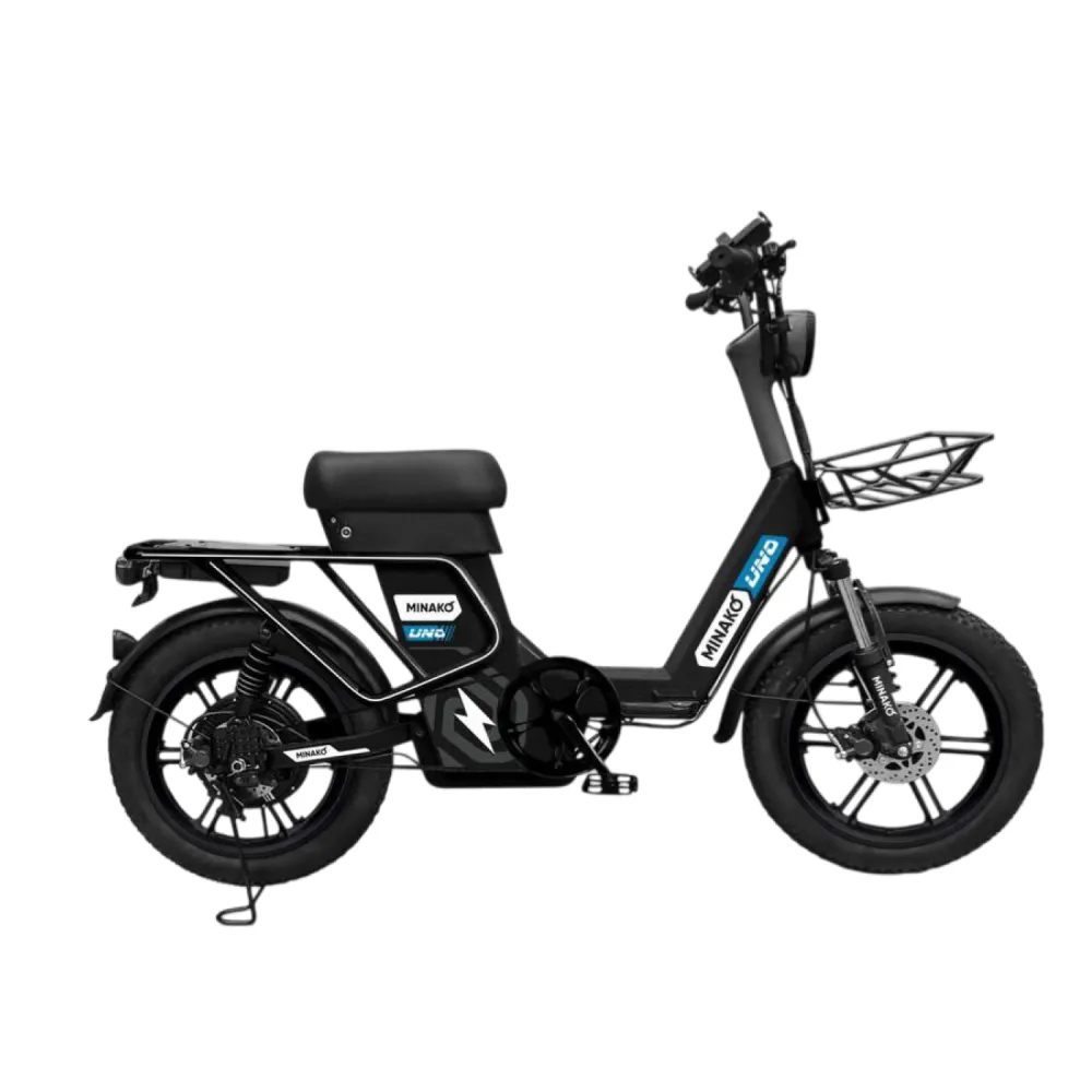 Электровелосипед Minako UNO 21Ah — надёжный городской вариант с мотором, пробегом до 80 км и грузоподъёмностью 180 кг. Он сочетает комфорт амортизаторов, гидравлику и аксессуары для повседневных поездок.