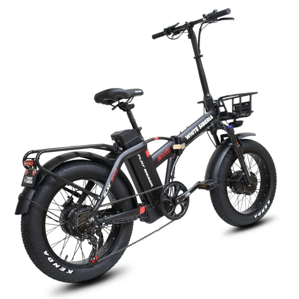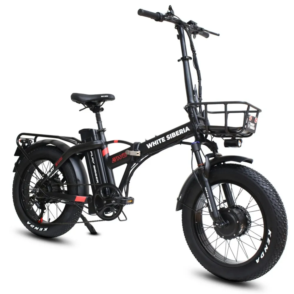 WHITE SIBERIA SLAV 2WD 2000 Вт — это складной фэтбайк с полным приводом, оснащённый двумя мощными электродвигателями по 1000 Вт каждый, что обеспечивает суммарную мощность 2000 Вт. Благодаря этому велосипед легко преодолевает крутые подъёмы и сложные участки дороги, делая поездки комфортными и динамичными как в городе, так и за его пределами.