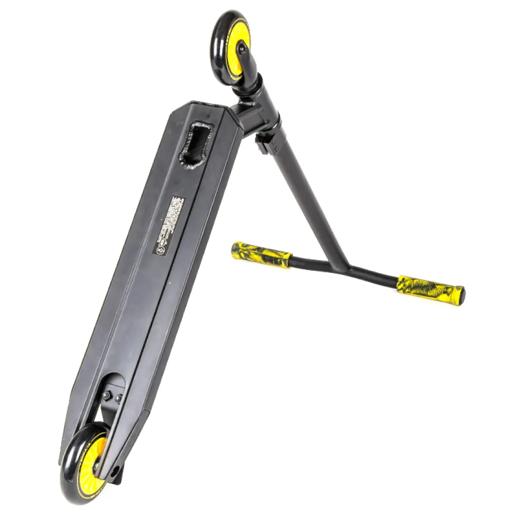 Произведенный в классически черном цвете самокат понравился отечественным пользователям и юным райдерам из СНГ благодаря техническим характеристикам. Простая в управлении техника обещает отличное время провождение, станет надежным другом в освоении новых навыков мастерства. Рулевая часть изготовлена из долговечной стали, дека – их легкого алюминиевая, по длине, ширине и расстоянии ног имеет размеры длину 48 см*10см*32,5см. Прорезиненные грипсы не допускают соскальзывание рук при исполнении трюков. 100-мм колеса в сочетании с учением райдера способны разогнаться до максимальных скоростей, сделать возможное, чтоб трюк состоялся.