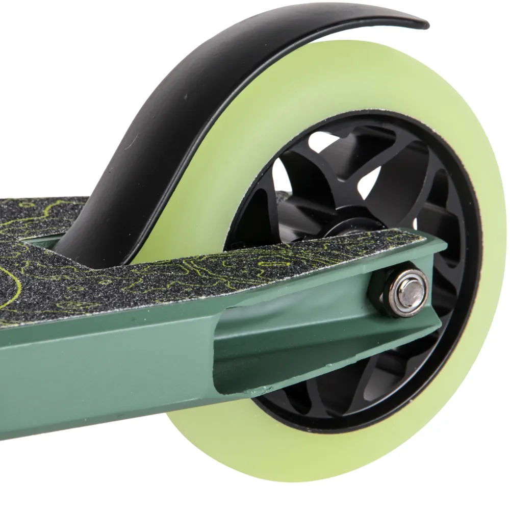 Производитель гарантирует надежность сборки, используя только фирменные детали. Повышенная комфортность техники обеспечивается благодаря удобной рулевой части. Резиновые накладки на руль самоката надежно закреплены. Имеют анатомически правильную форму, не скользят под руками. Трюковой самокат весом 3,75 кг позволит ощутить легкость передвижения и исполнения трюков. Приемлемая цена делает модель доступной для начинающих райдеров. Абсолютная безопасность самоката обеспечивается благодаря качественным задним ножным тормозам. Колеса диаметром 110 мм из прочного полиуретана позволяют прочно сцепляться с любой дорожной поверхностью.